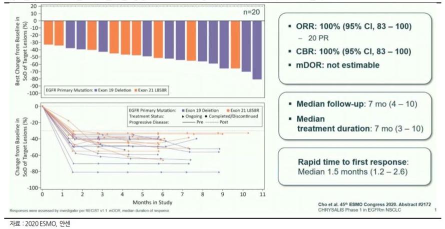 우선 이전 치료경험이 없는 환자 20명을 대상으로 레이저티닙+아미반타맙 병용시 ORR이 100%를 기록했다. 20명 모두 반응이 나온 것이다.