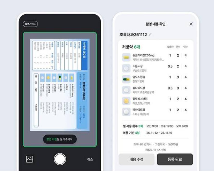 네이버에 따르면 이용자는 약 봉투를 촬영하면 번거로운 입력 없이 처방받은 약, 복용 일정을 자동으로 등록하고 관리할 수 있다. 약 정보 요약 및 봉투 촬영 후 데이터 변환에 광학 문자 인식(OCR)을 포함한 인공지능(AI) 기술들을 활용해 편의성을 높였다.
