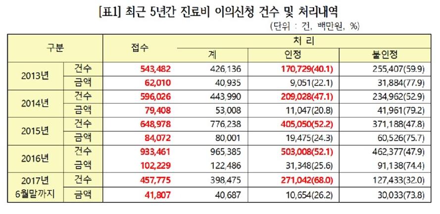 19일 국회 보건복지위원회 소속 김명연 의원(자유한국당)이 심평원으로부터 제출받은 자료에 따르면, 의료기관이 2013년부터 2017년 6월까지 4년 6개월간 심평원에 제출한 진료비 이의신청 건수는 317만9722건이었다.