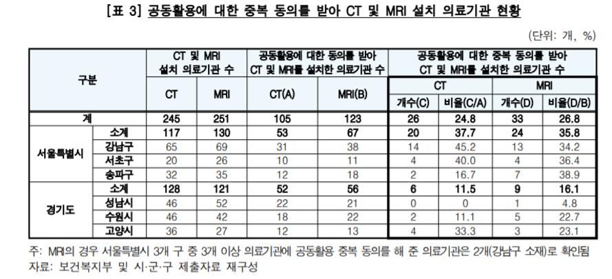 공동활용에 대한 중복 동의를 받아 CT 및 MRI를 설치한 의료기관이 서울특별시(강남구 등 3개 구)의 경우 CT는 20개(강남구 14개, 서초구 4개, 송파구 2개), MRI는 24개(강남구 13개, 서초구 4개, 송파구 7개) 의료기관으로 확인됐다. 경기도(성남시 등 3개 시)의 경우 CT는 6개(수원시 2개, 고양시 4개), MRI는 9개(성남시 1개, 수원시 5개, 고양시 3개) 의료기관으로 확인됐다.