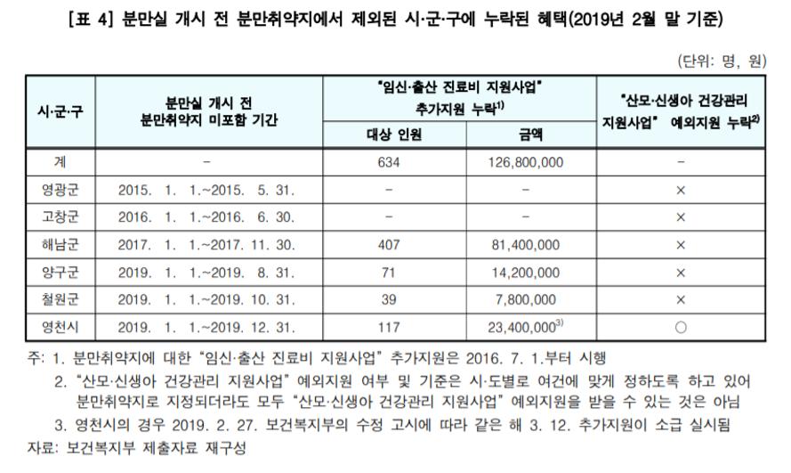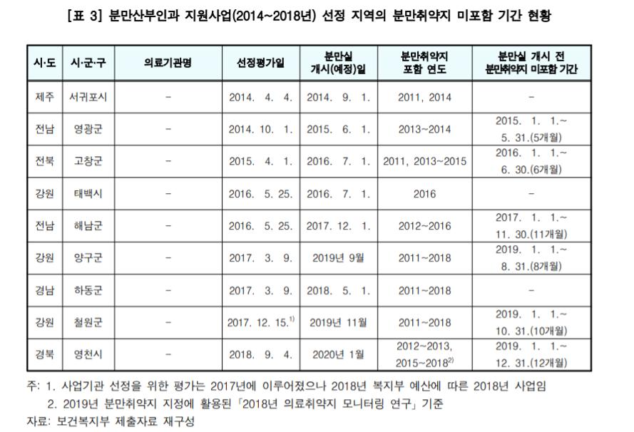 그 결과 전라남도 영광군(2014년 사업 선정), 전라북도 고창군(2015년 사업 선정), 전라남도 해남군(2016년 사업 선정), 강원도 양구군(2017년 사업 선정), 강원도 철원군 및 경상북도 영천시(2018년 사업 선정) 등 총 6개 시·군·구는 관내에 분만실 운영이 개시되지 않아 분만실까지의 접근성이 개선되지 않았는데도 최대 12개월, 평균 8.7개월 동안 분만취약지에서 제외됐다.