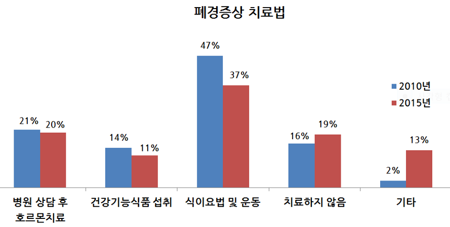 폐경 증상을 개선하기 위해 여성들이 가장 많이 선택한 치료 방법은 식이요법과 운동(36.5%)이었으며, 호르몬 치료(19.7%), 건강기능식품(11.4%) 등이 그 뒤를 이었다.