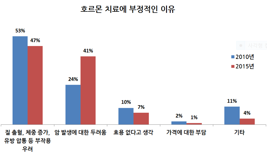 호르몬 치료에 부정적인 이유로는 질 출혈, 체중 증가, 유방 압통과 같은 부작용에 대한 우려와 암 발생에 대한 두려움이 전체의 77%(2010년), 88%(2015년)를 차지해 5년 사이 호르몬 치료제를 부정적으로 인식하는 원인에도 큰 변화가 없었다.