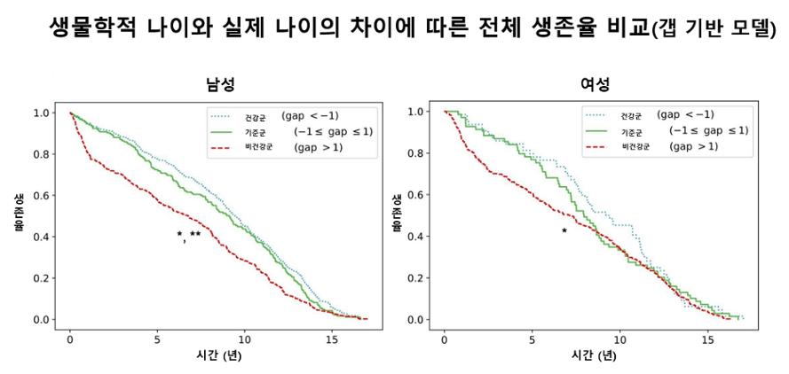 서울대병원-네이버, 생물학적 나이와 실제 나이의 차이에 따른 전체 생존율 비교 (갭 기반 모델)