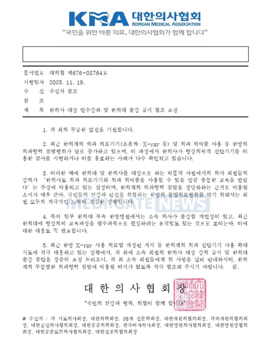 이어 “최근 한방 엑스레이 사용 의료법 개정안 저지 등 한의계의 의과 진단기기 사용 확대 시도에 적극 대응하고 있는 상황에서 소속 회원의 한의사 대상 강의 금지 및 한의대 출강 중단을 정중히 요청드린다”며 “한의계의 무분별한 의과 영역 침탈에 악용될 여지가 없도록 적극 협조해 주시길 바란다”고 덧붙였다.