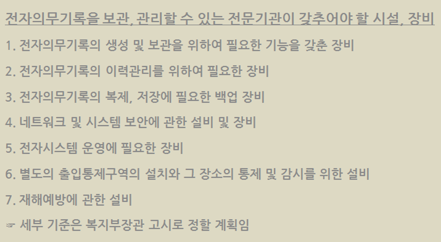 복지부는 전문기관의 요건을 전자문서 및 전자거래 기본법 상의 공인전자문서센터의 시설ㆍ장비 규정을 참조해 마련할 계획이다.