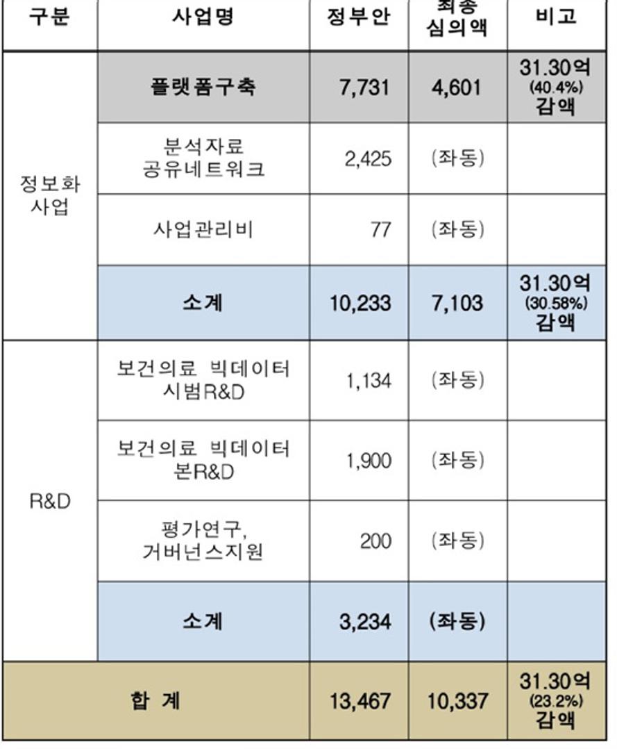 복지부의 2018년 빅데이터 관련 예산은 빅데이터 플랫폼 구축 46억100만원, 분석자료 공유 네트워크 24억2500만원, 사업관리비 7억7000만원, 보건의료 빅데이터 시범 연구개발(R&D) 13억3400만원, 보건의료 빅데이터 본R&D 19억원, 평가연구·거버넌스 지원에 2억원 등 총 103억3700만원이다.