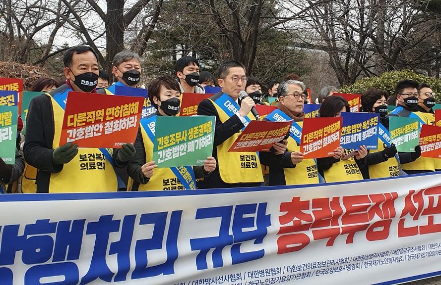 장인호 임상병리사협회 회장도 "보건복지의료연대 총궐기대회 개최를 시작으로 수단가능한 모든 방법을 동원해 우리의 결연한 투쟁 의지를 표명할 것"이라며 "간호법이 폐기될 때까지 모든 수단과 방법을 총 동원한 총력투쟁을 전개해 나갈 것임을 재차 강력하게 밝힌다"고 강조했다.