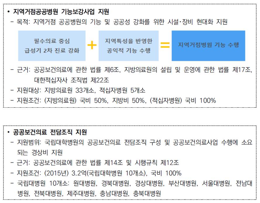 공익의료자원의 확충을 위해 필수의료 공공병상 확보가 필요하다. 그러나 우리나라의 병상은 경제협력개발기구(OECD) 국가 평균의 약 2.8배로 이미 공급과잉 상태여서, 필수의료 강화를 위한 의료기관 신설에는 재정적 한계가 있는 것이 분명하다. 이 보다는 정부가 민간병원을 매입해 국공립 법인으로 변경한 뒤 이를 직접 운영한다거나 민간병원의 병상을 매입하고 병상의 관리는 민간에서 하되 관리운영비를 지원하는 등의 대안을 검토해 볼 필요가 있다.