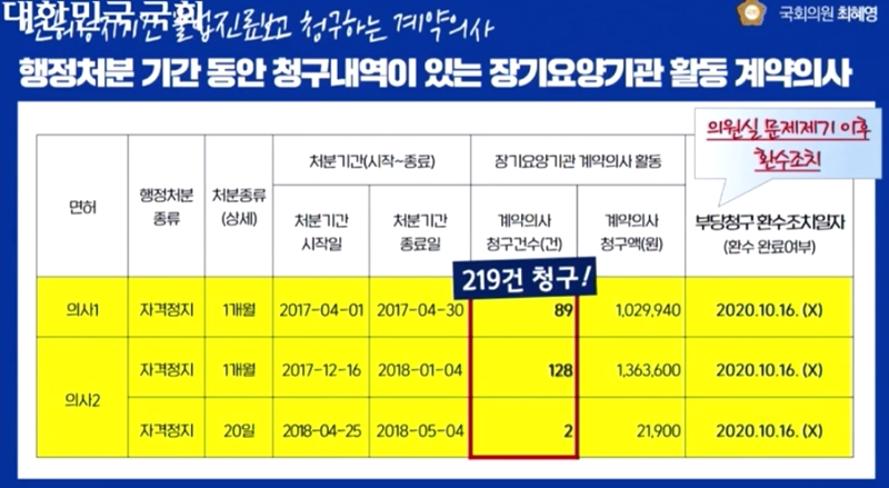 최 의원은 "면허정지 의사가 의료현장에서 활동할 수 없고, 건보공단은 해당 의사에게 급여비를 지급하면 안 된다"면서 "그러나 장기요양기관의 계약의사(촉탁의) 중 행정처분 기간에 해당하는 의사가 9명에 달했고, 이중 2명의 의사는 200건 넘게 청구했으며 공단이 이를 모두 지급했다"고 밝혔다.