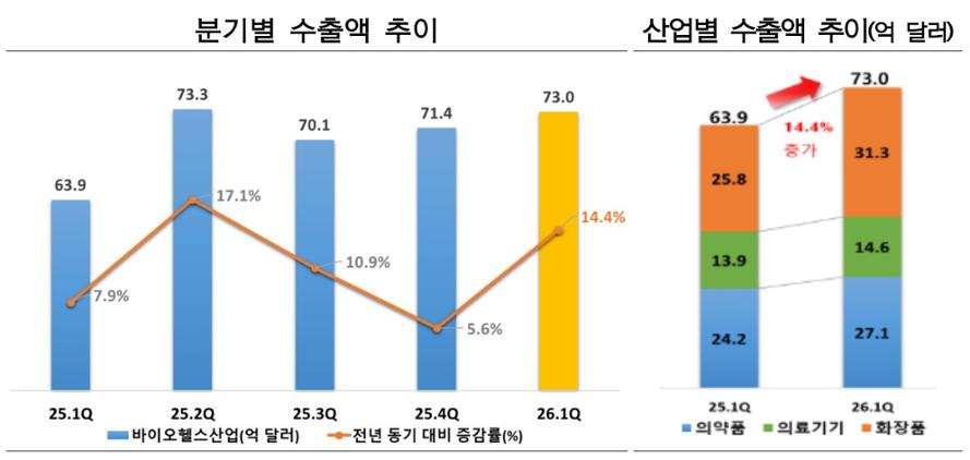 의약품은 유럽을 중심으로 바이오의약품 수요가 확대되면서 수출 증가세가 지속됐으며, 의료기기는 초음파 영상진단기와 전기식 의료기기 등 일반 의료기기를 중심으로 안정적인 증가 흐름을 보였다. 화장품은 K-뷰티에 대한 글로벌 수요 확대와 미국, 영국 시장 수출 증가에 힘입어 분기 기준 최대 실적을 달성했다.