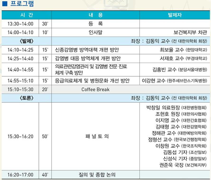 이날 공청회는 감염병 대응(감염병 감시·역학조사 등 초기 대응체계, 감염병 거버넌스, 전문인력 양성, 진단·실험연구체계 등), 병원관리(의료 관련 감염 예방 및 관리, 감염병 전문병원, 응급실 진료체계 개편, 의료전달체계 개편, 병원문화 개선 등) 2개 분야에 대한 발제에 이어 토론이 이어진다.
