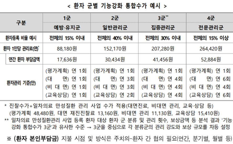 보건복지부가 준비한 서비스의 구체적인 부분들을 요소들을 보면, 1군과 2군은 기존의 만성질환관리제의 그것을 그대로 가져왔고, 3군과 4군은 병원의 장기 입원이나 요양병원 입원의 경우 행해지는 의료행위를 재택의료, 방문간호 수준으로 끌어내린 것으로 보인다. 주치의제를 표방하면서 만관제 + 재택의료를 통합한 것을 일차의료 혁신 시범사업이라고 한 것이다.