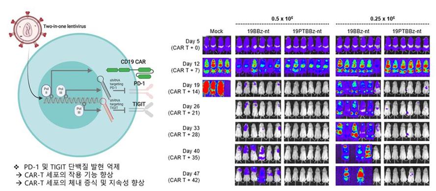 실제 생쥐를 이용한 백혈병과 림프종 모델에서 이들 shRNA를 통해 T세포의 기능 저하를 유도하는 2종의 면역관문 수용체인 PD-1과 TIGIT의 발현을 동시에 억제했을 때, CAR-T 세포의 항암기능이 향상되는 것으로 나타났다.