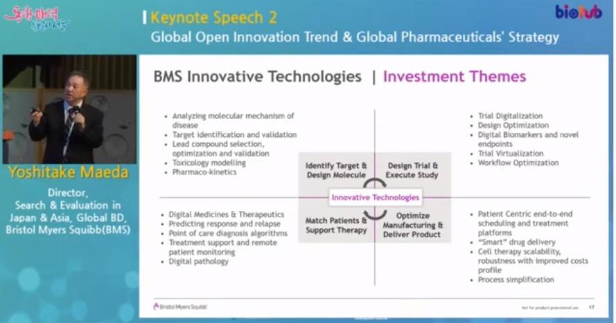BMS는 R&D 확장에 있어서 '오픈이노베이션 전략'을 우선에 두고 있다고 밝혔다. 사진 = BMS 요시다케 마에다 이사 서울 바이오·의료 국제 콘퍼런스 생중계 갈무리.