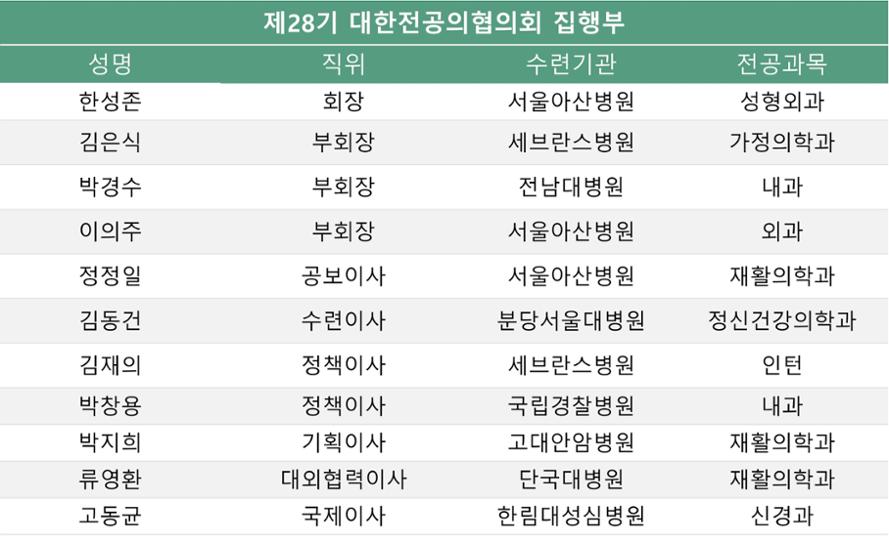대전협은 3일 28기 집햅부 임원 명단을 공개했다. 한성존 신임 회장(서울아산병원 성형외과)을 필두로 김은식 부회장(세브란스병원 가정의학과), 박경수 부회장(전남대병원 내과), 이의주 부회장(서울아산병원 외과) 등 부회장 3인 체제가 갖춰졌다.