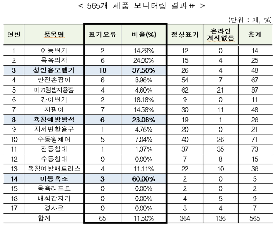 사진: 국민건강보험공단 제공(2017년 인터넷 복지용구 제품 표기 점검 결과)