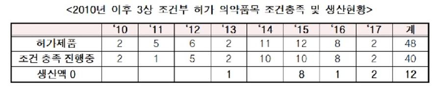 17일 국회 보건복지위원회 소속 김상훈 의원(자유한국당)이 식약처로부터 제출받은 ‘3상 조건부 허가 품목 현황(2010~2016)’에 따르면, 2010년부터 올해까지 신속 허가를 받은 의약품은 48개였고 이 중 12개(25.0%)는 공급(수입·생산) 실적이 전혀 없었다.