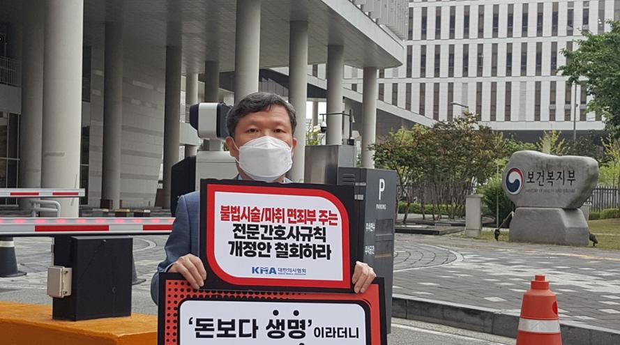 김 이사장은 13일 학회의 복지부 앞 1인 시위를 해산하며 낸 성명문을 통해 “대리수술이 불법이듯이 간호사에 의한 대리마취 또한 불법임이 법률적·행정적으로 이미 최종 판정됐고, 도덕적으로도 용납되지 않는다”며 개정안의 부당함을 역설했다.