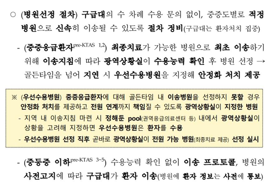 Pre-KTAS 3~5등급의 중등증 이하 환자는 수용능력 확인 없이 이송 프로토콜, 병원의 사전 고지에 따라 구급대가 환자를 이송한다. 환자 정보는 병원에 사전 통보하도록 했다.