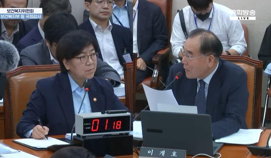 사진 왼쪽부터 보건복지부 정은경 장관과 더불어민주당 이개호 의원. 사진=국회방송