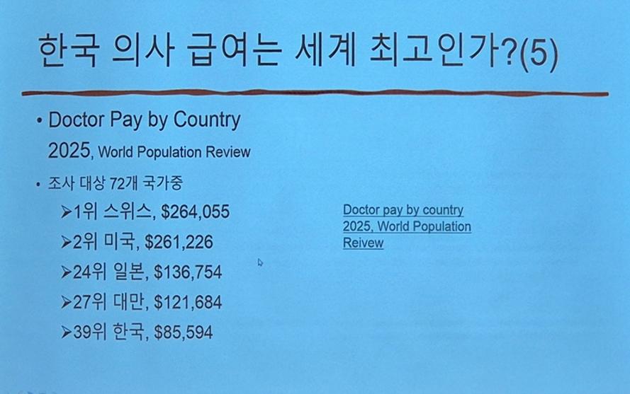 장 교수는 72개국을 대상으로 조사한 World Population Review 2025 자료도 근거로 들었다. 해당 조사에 따르면 의사 연봉 1위는 26만4055달러(한화 약 3억 8700만원)의 스위스 2위는 미국(3억 8500만원)이다. 한국(약 1억 2500만원)은 39위로 일본(24위∙약 2억원), 대만(27위∙약 1억 7800만원)보다도 낮다.