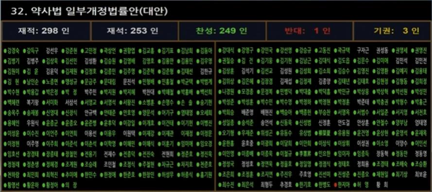 약사법 개정안 국회의원별 찬·반 표결 현황. 사진=국회인터넷의사중계시스템