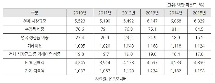 전체 생산품 중 수입 비중은 2013년 이후 꾸준히 상승해 2015년에는 전체 시장의 84.5% 차지했다. 영국 내 수입동향 분석을 살펴보면, 독일, 네덜란드, 벨기에, 미국이 약 25억 달러(한화 2조 7천억 원)로 전체 수입의 70% 이상을 차지했다.