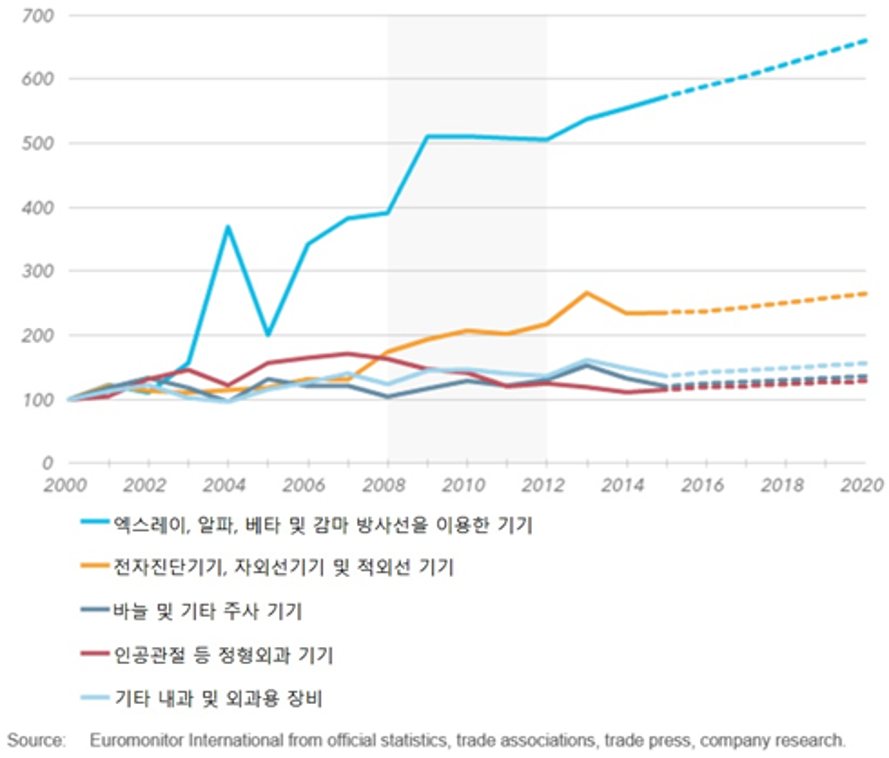 의료기기 종류별 성장 전망은 2000년을 기준(100)으로 분석했을 때 엑스레이·알파·베타·감마선을 이용한 방사선기기의 성장 속도가 제일 빠를 것으로 전망됐다. 2018년 방사선기기 시장은 2000년 대비 6배 이상 성장할 것으로 분석됐고, 그 뒤를 이어 전자진단기기, 자외선 기기 및 적외선 기기가 유망할 것으로 전망됐다. [그래프 1] 영국의 의료기기 종류별 성장 전망(2000~2020년) (출처: KOTRA 홈페이지)