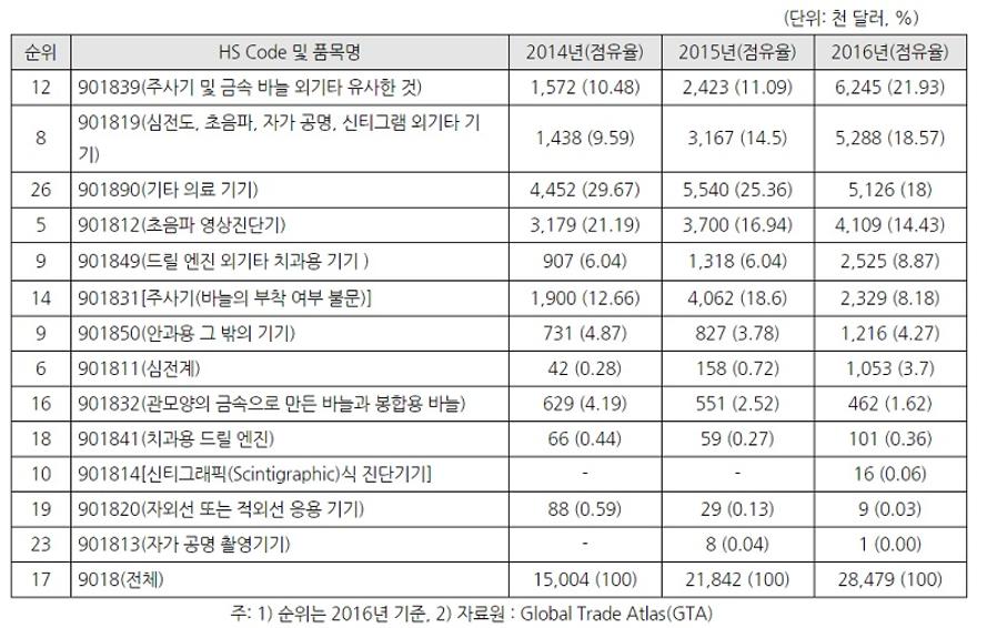 한국 의료기기의 수입 규모는 주사기, 기타의료기기, 초음파 영상진단기 등을 포함해 2016년 약 2천 8백만 달러(한화 308억 원)를 차지했다. [표 2] 영국의 최근 3년간 대 한국 의료기기 수입 규모(출처: KOTRA 홈페이지)