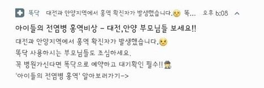 지난 8일 기준 대전의 한 소아전문병원 8명, 경기도 안양시의 한 대학병원 25명 등 잇달아 홍역 확진 판정을 받았다. 똑닥은 전국적으로 홍역의 위험이 커지자 똑닥 앱 사용자 모두에게 홍역 주의 푸시 알림을 전송해 홍역 관련 건강 정보를 제공함은 물론 똑닥을 통한 예약 및 접수를 안내하고 있다고 밝혔다.