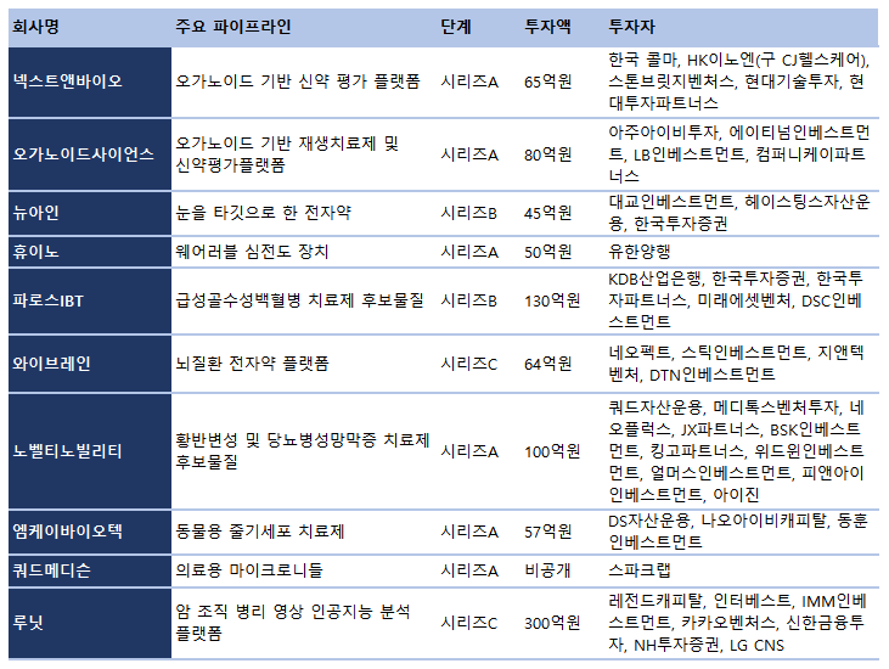 이 가운데 넥스트앤바이오와 오가노이드사이언스 휴이노, 노벨티노빌리티, 엠케이바이오텍, 쿼드메디슨은 시리즈A, 뉴아인과 파로스IBT는 시리즈B, 와이브레인과 루닛은 시리즈C 단계 투자를 이끌어냈다.