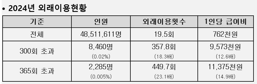 복지부에 따르면 연 300회를 초과하는 외래 의료 이용자는 2024년 기준 약 8460명에 달한다. 이들의 연평균 외래이용 횟수는 357.8회로 전체 평균에 비해 18.3배 높다. 이들에게 지급되는 1인당 급여비는 평균 대비 12.6배다.