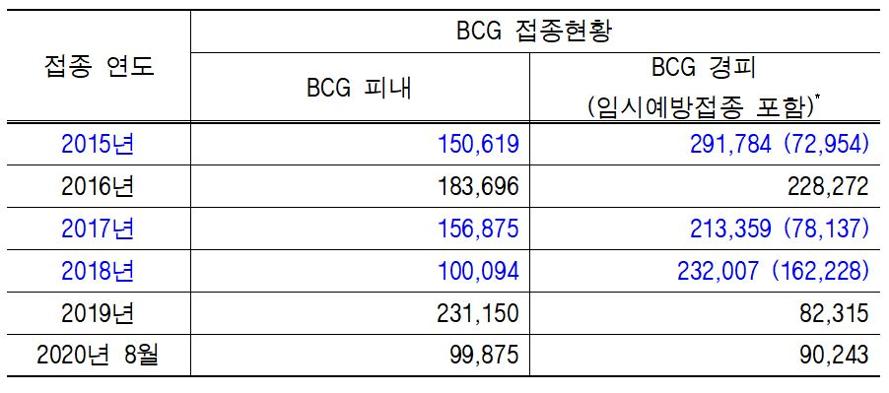 국회 보건복지위원회 더불어민주당 남인순 의원(서울 송파구병)은 7일 질병관리청으로부터 제출받은 피내용 BCG백신과 경피용 BCG백신 접종현황 국정감사를 분석해 이같이 지적했다.