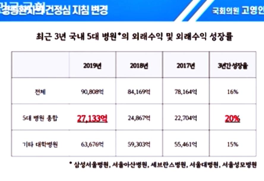 고 의원실에서 분석한 결과 5대 병원의 외래수익이 2017년 2조 2704억원에서 2019년 2조 7133억원으로 3년 동안 20% 증가했다고 밝혔다. 반면 빅5병원의 입원수익은 2019년 3조8125억원으로 전년 대비 13% 늘어 외래환자의 성장률보다는 밑돌아 경증환자의 이용이 증가하는 것을 방증했다. 표 = 국회의사중계시스템 갈무리.