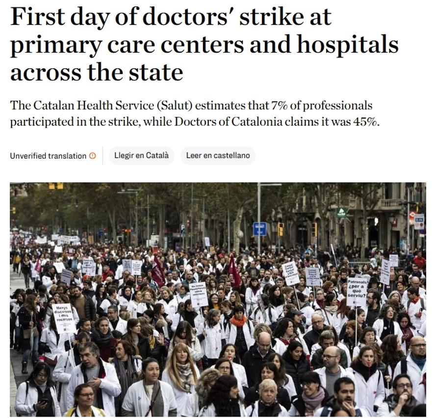 스페인 의사 파업을 다룬 현지 보도. 사진=카탈루냐 일간지 디아리 아라(Diari ara).