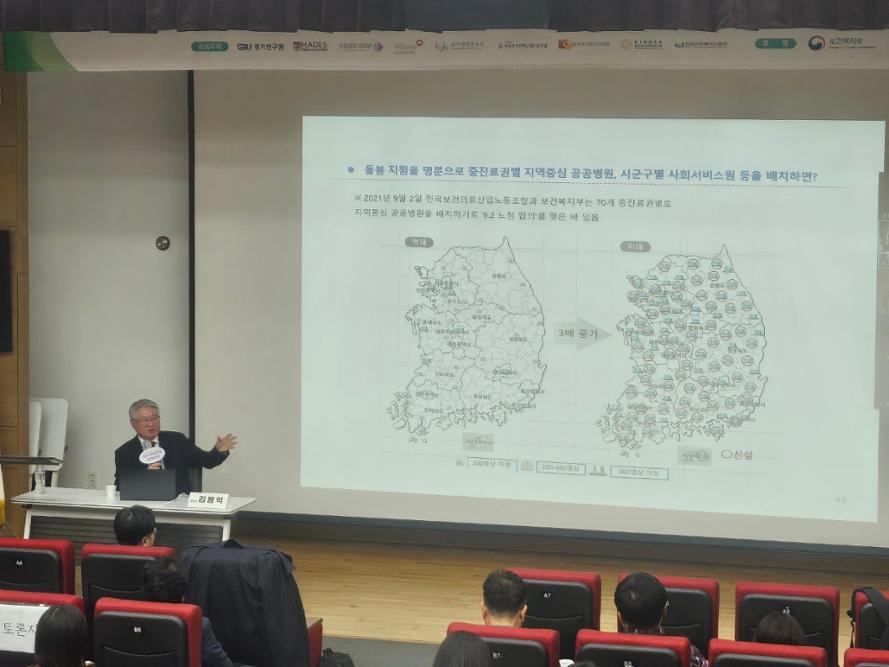 향후 '공공병원과 돌봄 복지'를 융합하는 구체적인 정책 방향성도 언급됐다. 김 이사장은 "공개적으로 언급하는 것은 처음인데, 돌봄이 향후 복지 국가로 가는 길에서 굉장히 중요한 역할을 할 것이다. 돌봄을 계기로 사회 서비스 인력의 노동 여건을 개선하거나 돌봄을 통해 지역 균형 발전을 유도할 수도 있다"며 "이를 위해 공공병원을 중진료권 별로 70개 확충하자는 주장이 나오는데 공공의료 인프라에 노인·장애인 돌봄을 할 수 있는 사회서비스원을 적절히 배치하면 한국 보건복지 체제를 뒤집어 놓을 만큼 파급력이 있을 것"이라고 강조했다.