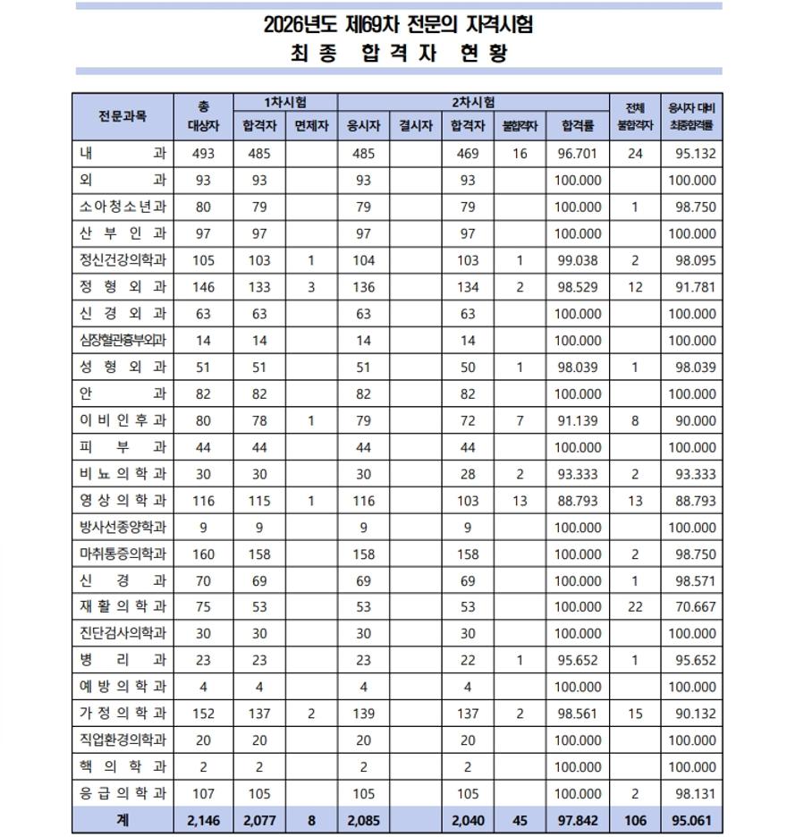 [메디게이트뉴스 박민식 기자] 대한의학회가 13일 발표한 2026년도 제69차 전문의 자격시험 최종 결과에 따르면, 총 대상자 2146명 중 2040명이 합격했다. 합격률은 95%다.