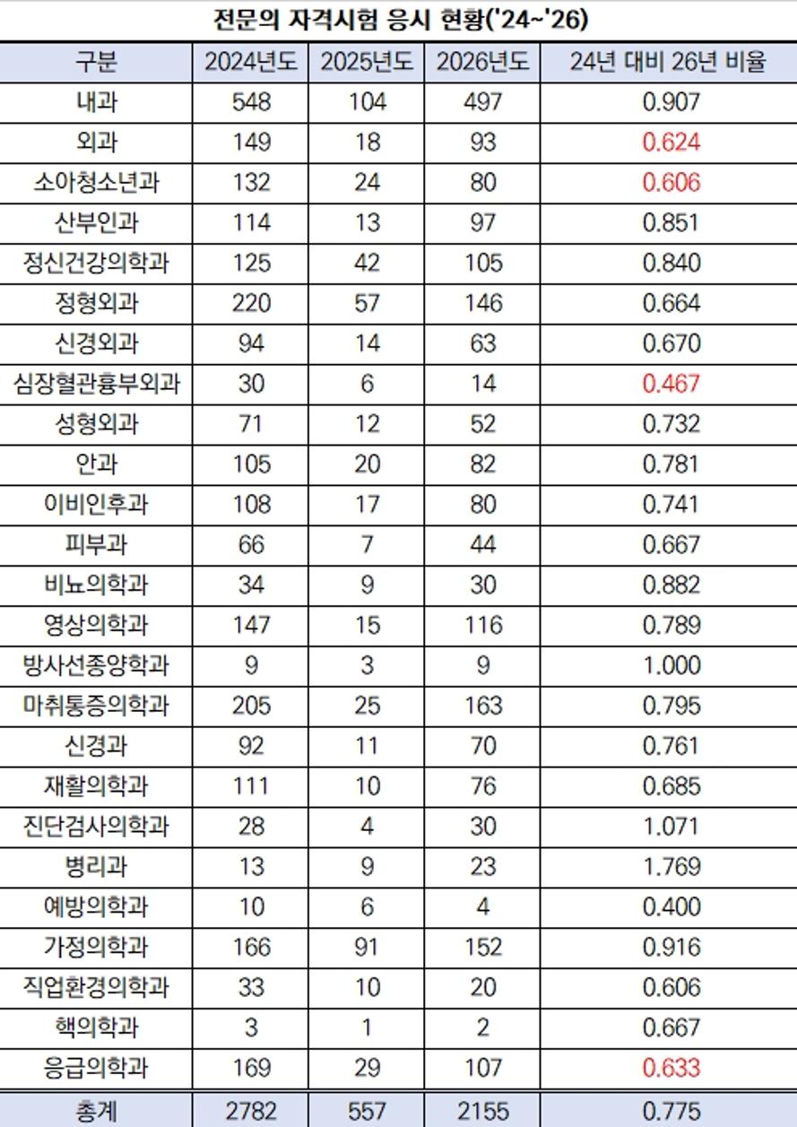 전문의 시험 응시자 올해 557명서 내년 2155명으로 증가…2년 전 대비 77.5% 수준