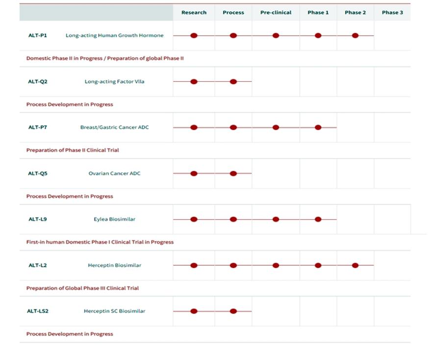 특별한 항체 위치에 톡신을 접합할 수 있는 NexMab™ 기술을 활용해 개발 중인 항암신약(ALT-P7, ALT-Q5)은 다양한 면역관문억제제(면역항암제)와 병용하는 방식으로 연구를 추진 중이며, 연구 결과에 따라 임상단계에 맞게 기술이전, 공동연구 등을 시행할 계획이다. 전세계적으로 환자 중심주의, 편의성 확대 방향으로 의료서비스가 개선되고 있는 것을 고려해 성장호르몬치료제 개발 뿐 아니라 장기지속형 기술인 NexP™을 활용해 당뇨병, 혈우병, NASH(비알콜성지방간염) 등에 활용하는 방안을 검토하고 있다.