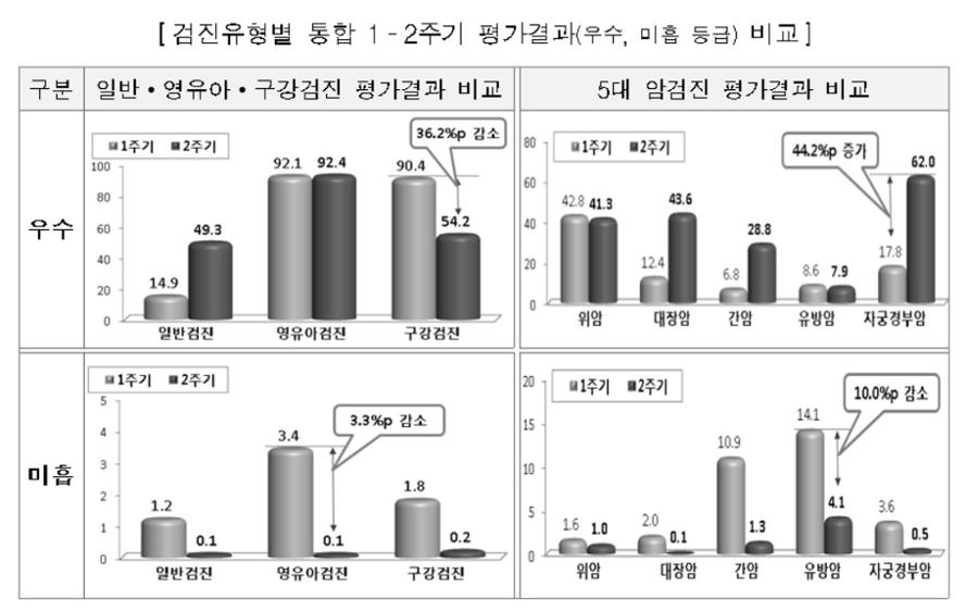 2주기 평가결과를 1주기 평가결과와 비교해 보면, 전반적으로 3년 전에 비해 국가검진의 질이 개선됐다. 검진유형별로는 일반검진, 대장암검진, 간암검진 및 자궁경부암검진의 4개 유형에서 평균점수와 우수등급 비율이 크게 상승했고, 전체(8개) 검진유형에서 미흡등급 비율이 줄었다. 다만 영유아검진과 구강검진은 2주기 평가방식이 자가입력 방식에서 자가입력 및 근거자료 제출로 바뀌면서 1주기에 비해 평균점수가 하락한 것으로 나타났다.