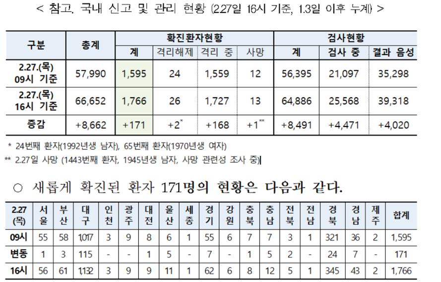 코로나19, 2000명 육박....하루만에 505명 늘어나 1766명, 검사중도 2만5000명