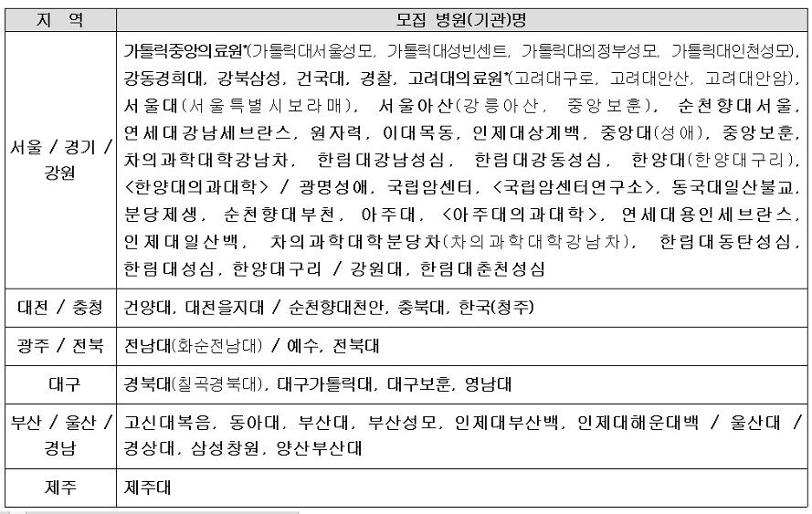 모집병원은 수도권의 경우, 가톨릭중앙의료원과 강동경희대, 강북삼성, 건국대, 고려대의료원, 서울대, 서울아산, 순천향대서울, 연세대강남세브란스, 중앙대, 중앙보훈, 한림대강남성심, 한양대, 연세대용인세브란스 등이다.