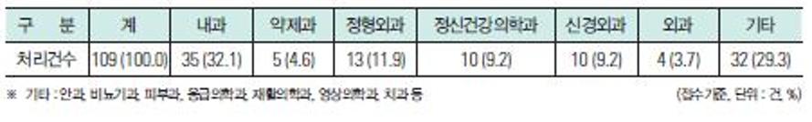 진료과별 의약품 분쟁 처리건수를 보면 내과가 35건(32.1%)으로 가장 많았고, 다음으로 정형외과 13건(11.9%), 정신건강의학과와 신경외과가 각각 10건(9.2%) 순이었다.