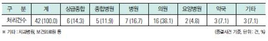 의약품 관련 의료분쟁 처리건수를 의료기관 종별로 살펴보면, 의원이 16건(38.1%)으로 가장 많고, 병원 7건(16.7%), 상급종합병원 6건(14.3%)이 뒤를 이었다.