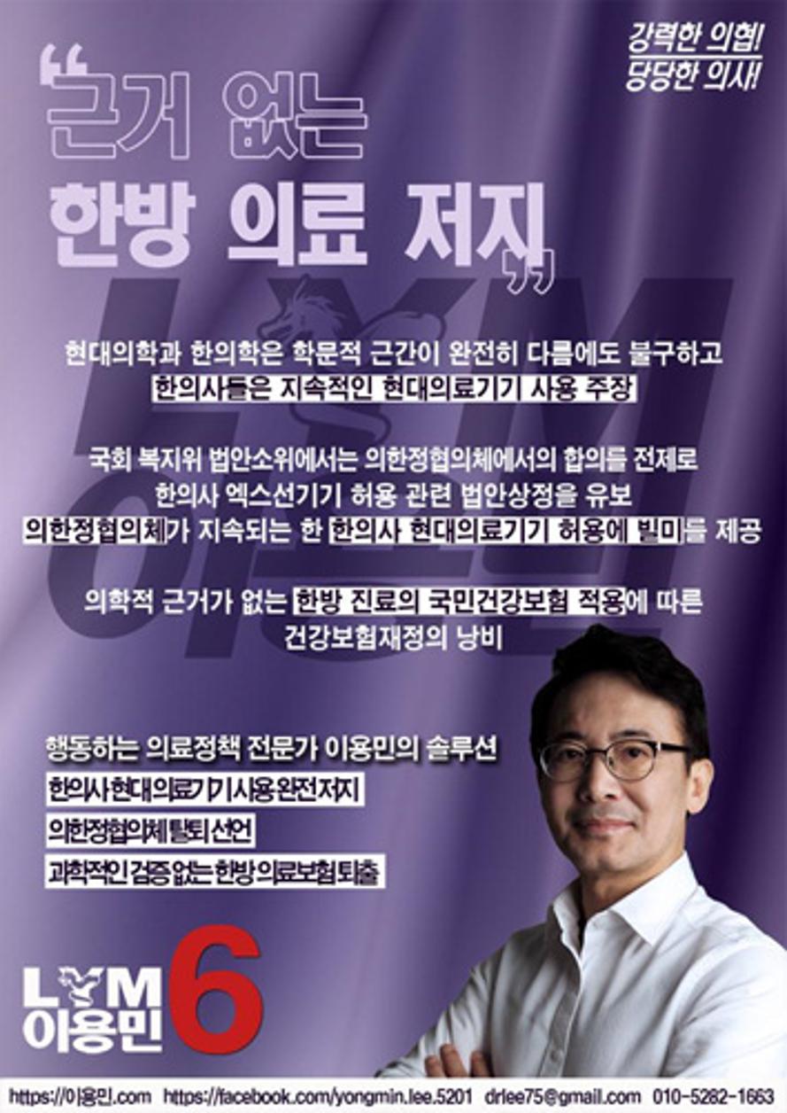 [메디게이트뉴스 임솔 기자] 제40대 대한의사협장 선거에 출마한 기호 6번 이용민 후보는 핵심 공약 중의 하나로 ‘근거 없는 한방의료 저지’를 내걸었다. 이후 지속적인 모니터링을 통해 서울시 성북구 난임부부 한방치료 지원사업에 심각한 문제가 있는 것을 발견했다.