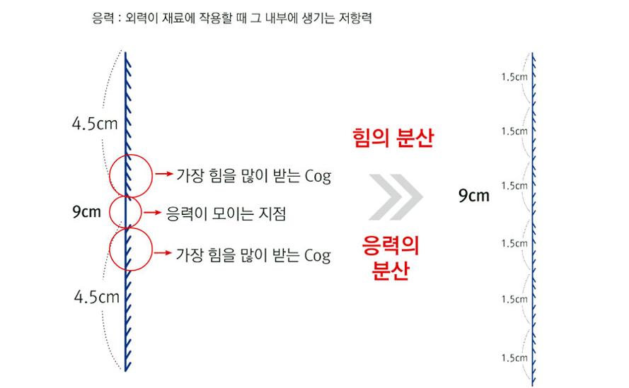 김 원장은 "기존 코그실은 각 돌기가 피부조직을 다 잡고 있는 게 아니라, 가운데만 잡고 있고 나머지는 곁다리로 작용한다는 한계가 있었다"면서 "응력을 균일하게 배분해 돌기가 각 조직에 고정돼야 좋은 리프팅 효과를 볼 수 있다"고 강조했다. 기존 코그실(좌)과 엔코그(우)의 비교