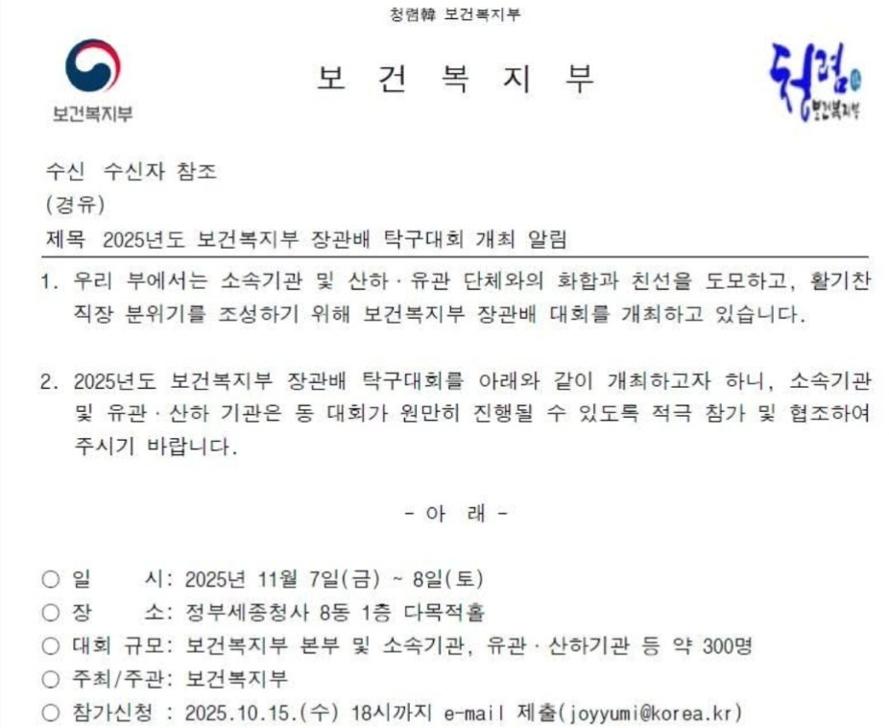 보건복지부 장관배 탁구대회 개최 관련 공문 내용.