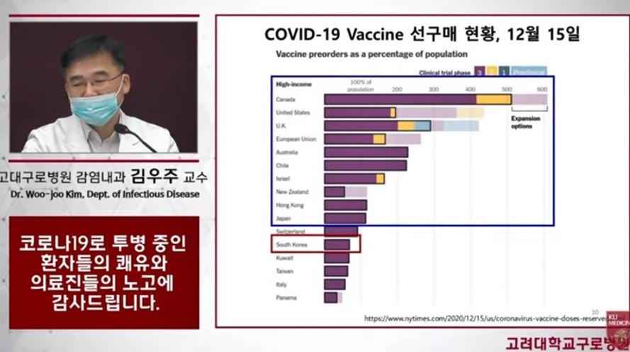 홍콩과 일본, 뉴질랜드도 전국민 접종 분량에 대해 선구매 계약을 마쳤으나, 우리나라는 4400만명분으로 88%에 그친다. 이마저도 정량이 다 들어올 수 있을지, 또 그 시기가 언제쯤인지 불확실한 상황이다.