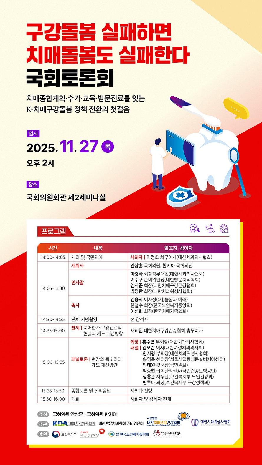 이번 토론회는 국회의원 안상훈·한지아 의원이 공동주최 하고, 대한치과의사협회·대한방문치의학회 준비위원회·대한치매구강건강협회·대한치과위생사협회가 주관하며 보건복지부·국민건강보험공단·한국노인복지중앙회·한국치매가족협회가 후원한다.